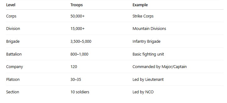 Command → Corps → Division → Brigade → Battalion → Company → Platoon → Section