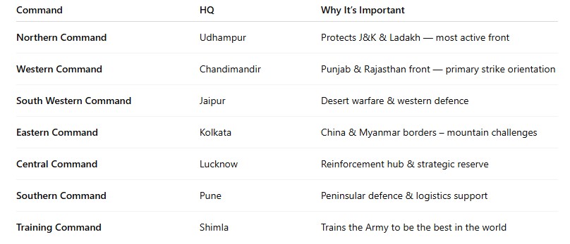 The Indian Army is divided into 7 operational commands + 1 training command — each guarding a major frontier: